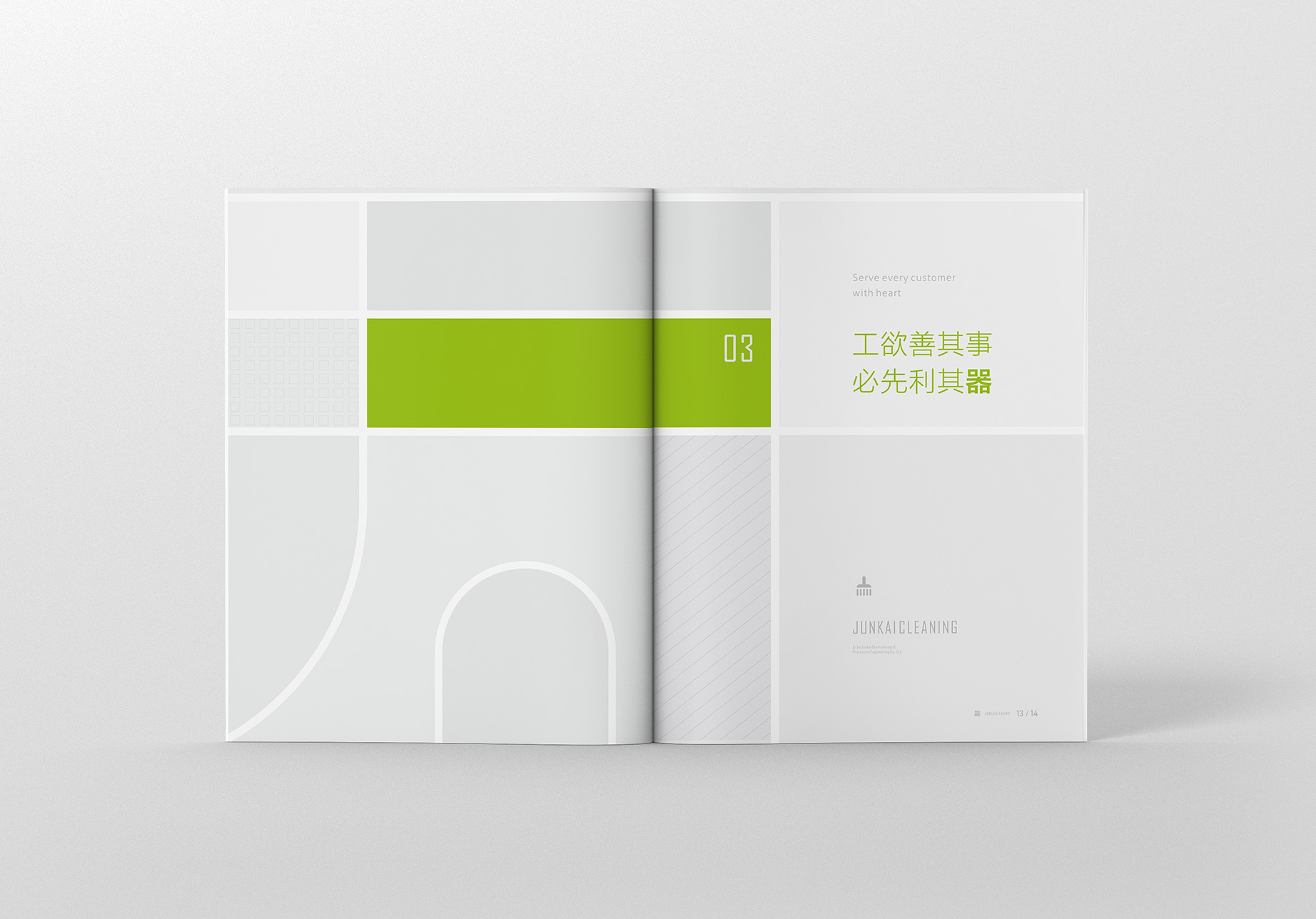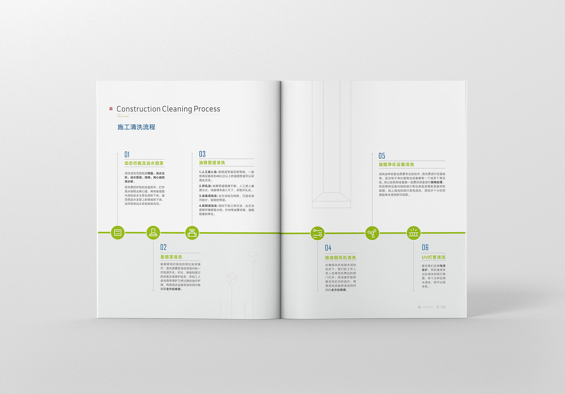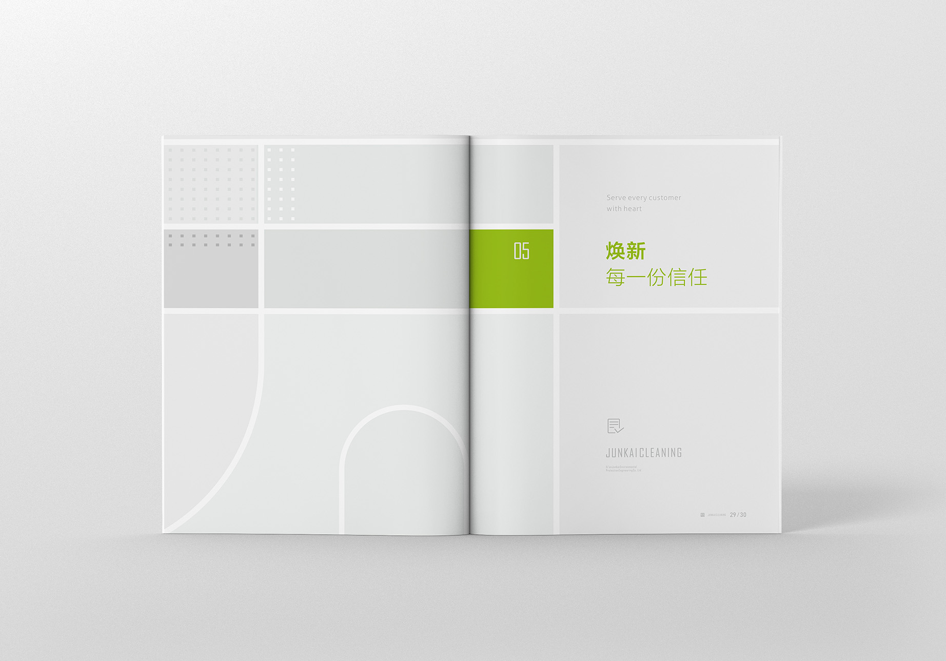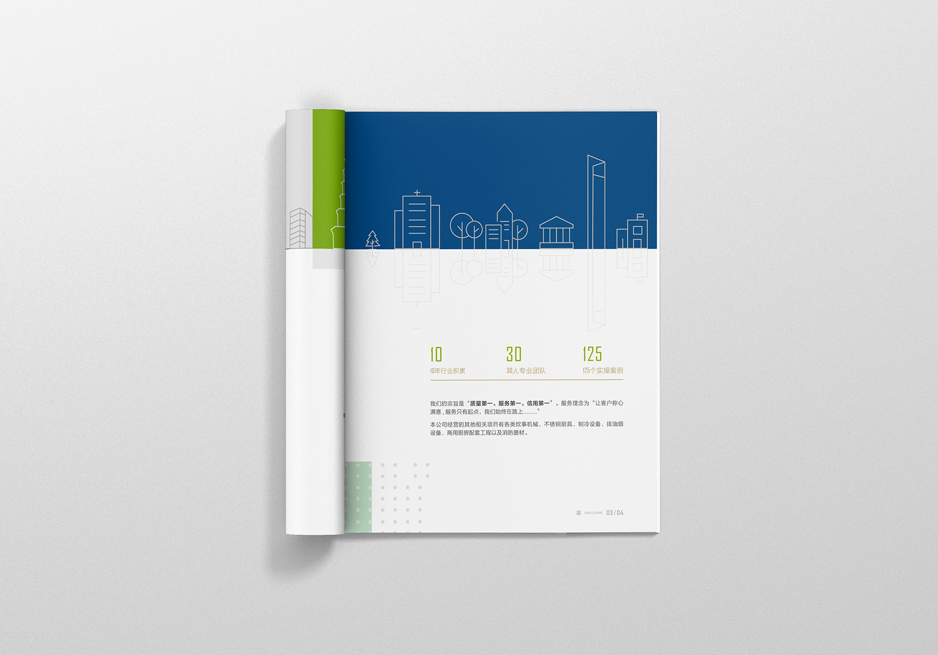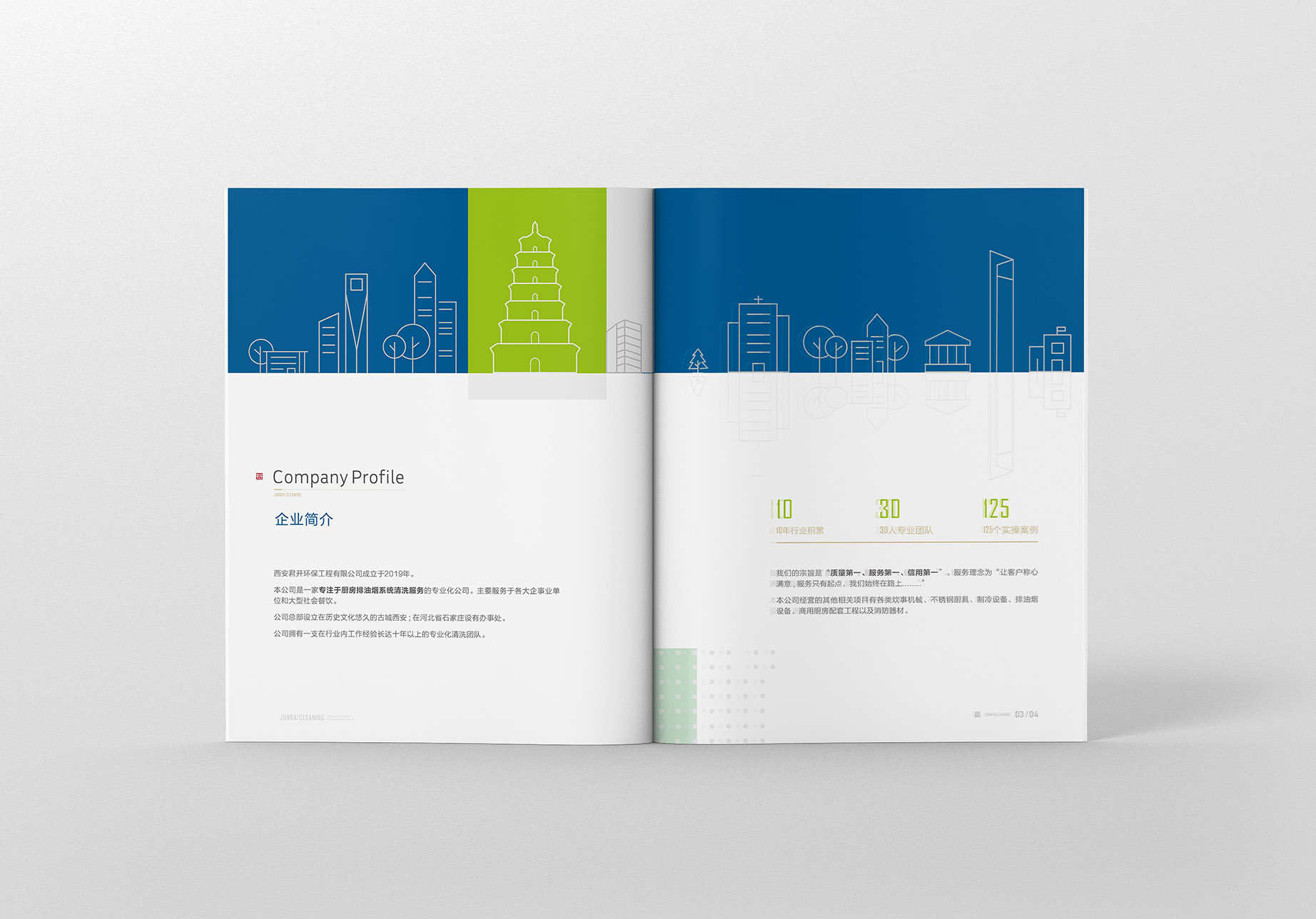君子以诚相待,故金石为开。君开清洁是一家专业特殊行业清洁公司,公司拥有三十人专业清洗团队,累计服务三百多家企事业单位。为扩大公司业务面,减少拓客沟通成本,更好地展示公司实力,设计一本集公司简介、业务范围、服务案例与一体的企业画册就显得尤为迫切了。