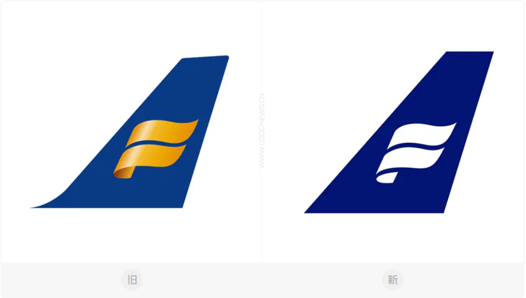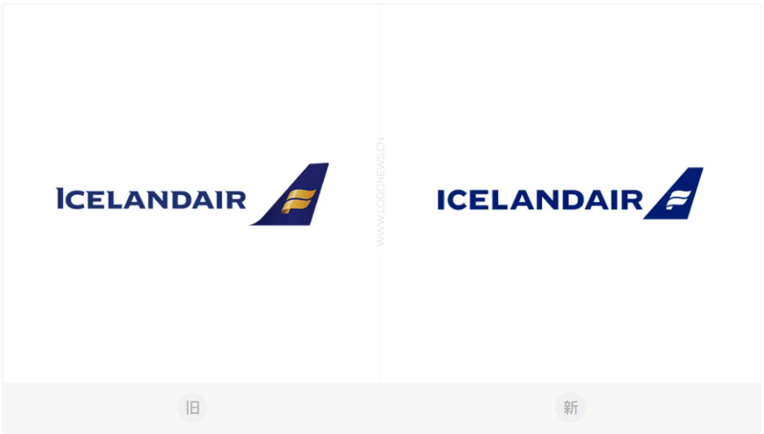 今年早些时候,冰岛航空更新了品牌LOGO,将蓝色的垂直尾翼中金黄色的图标改成单色。消除了尾翼左下方的尖角和圆角,「ICELANDAIR」文字也去掉多余装饰,和图形一样变为更规整的无衬线字体。
